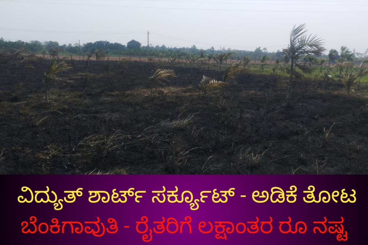 ವಿದ್ಯುತ್ ಶಾರ್ಟ್ ಸರ್ಕ್ಯೂಟ್ – ಬೆಲೆಬಾಳುವ ಅಡಿಕೆ ಮರಗಳು ಬೆಂಕಿಗಾವುತಿ. Electrical short circuit – valuable areca trees set on fire.