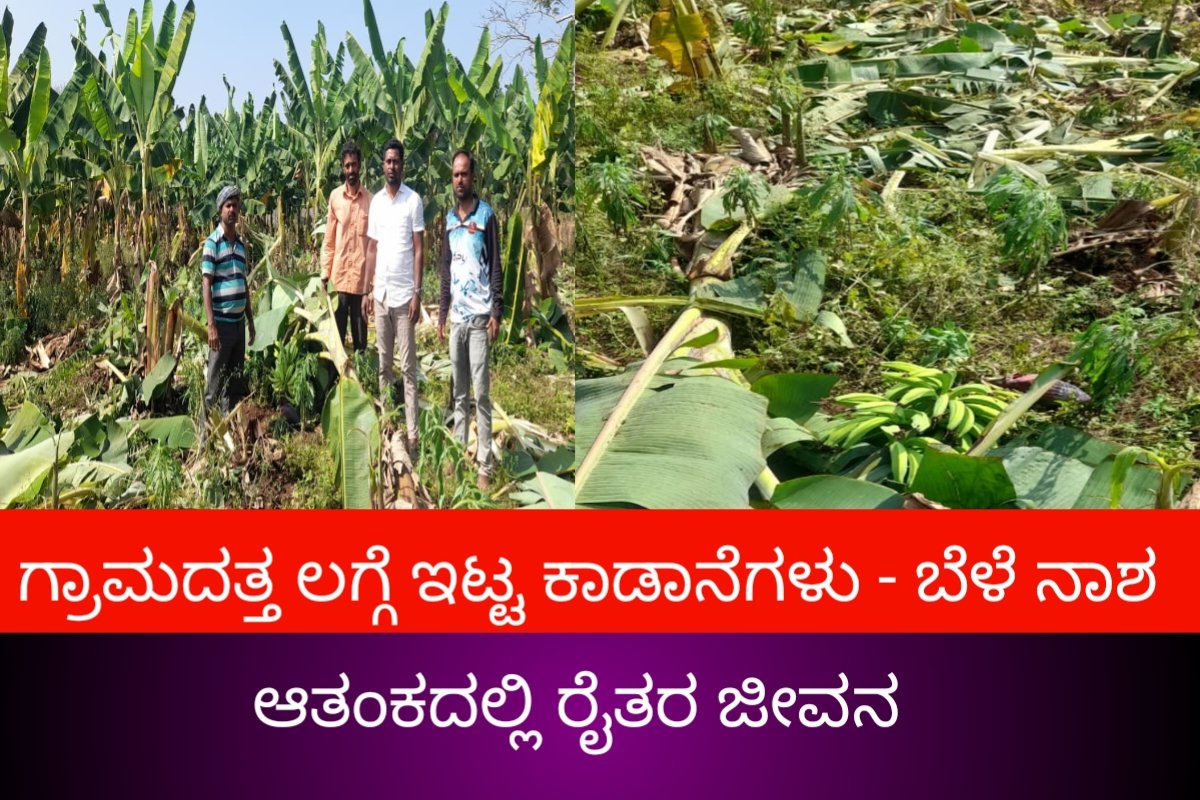 ಗ್ರಾಮದತ್ತ ಲಗ್ಗೆ ಇಟ್ಟ ಕಾಡಾನೆಗಳು – ಬೆಳೆ ನಾಶ – ಆತಂಕದಲ್ಲಿ ರೈತರು. Wild elephants enter village, destroying crops, farmers in fear.